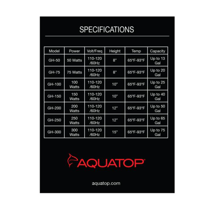 Maintain constant and stable temperatures for your aquatic creatures to thrive with AquaTop's GH-200W aquarium heater. This analog glass heater offers simple and easy installation with the use of the included suction cups. With the highly visible temperature setting, the GH-200W is easy to set and adjust to the desired temperature with the use of the Temperature Adjustment Knob. This powerful heater is made from high quality, double insulated glass and can handle aquariums up to 50 gallons. Suitable for fresh and saltwater tanks.