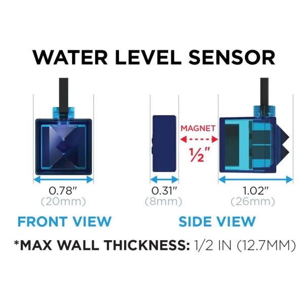 The HYDROS Water Level Sensor contains no moving parts that can fail. It’s extremely tiny: it’s a little over a half-inch thick with a circumference the size of a US penny. The optical eye is magnetically coupled with the magnet side measuring only ¼” thick. It can be mounted to most clear, tinted, or painted surfaces up to ½” thick. The sensor operates in the daytime or complete darkness so it’s safe for use hidden inside your aquarium stand or in the back chambers of an all-in-one aquarium. The sensor is easy to place, easy to move, and easy to clean. The sensor connects with any HYDROS Sense Port using an aviation-style plug for safe operation. No additional power source is needed to run the sensor.