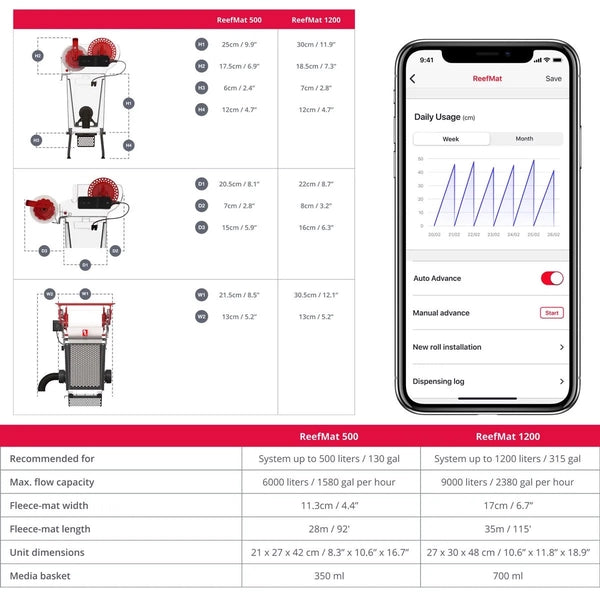 The ReefMat 500 comes with one 28m fleece roll (Replacement rolls can be found HERE). Each roll should last roughly 5-8 weeks on a moderately stocked 80 gallon reef system; however, bare-bottom tanks will typically exhaust rolls at a faster rate. Additionally, usage rate may be significantly higher for the first few weeks after installing a ReefMat while your system adjusts to the new level of mechanical filtration.